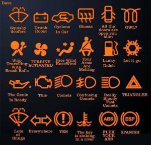 - Exclamation point surrounded by a “U” = Tire Pressure Monitor System/Tire pressures need to be checked