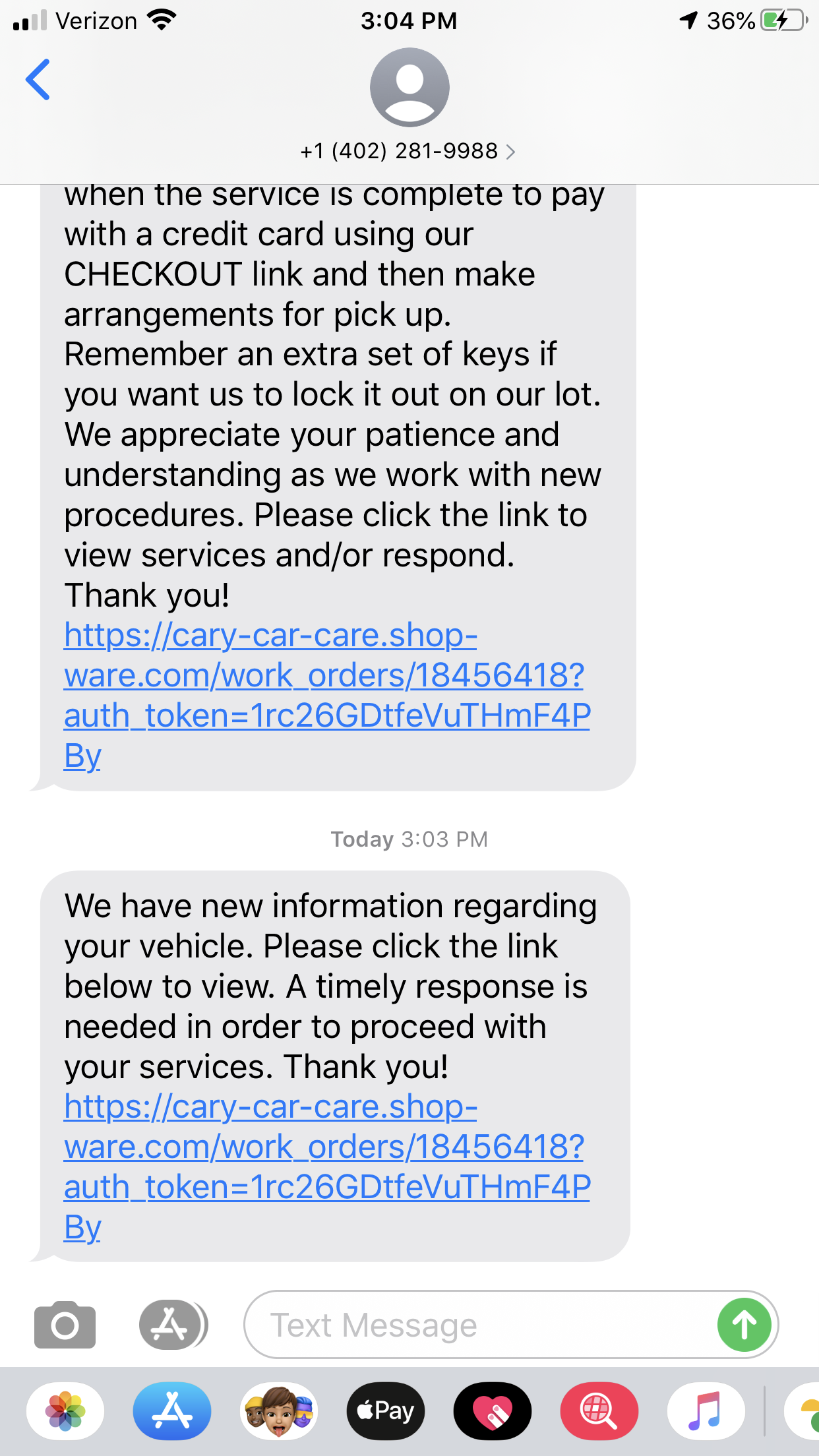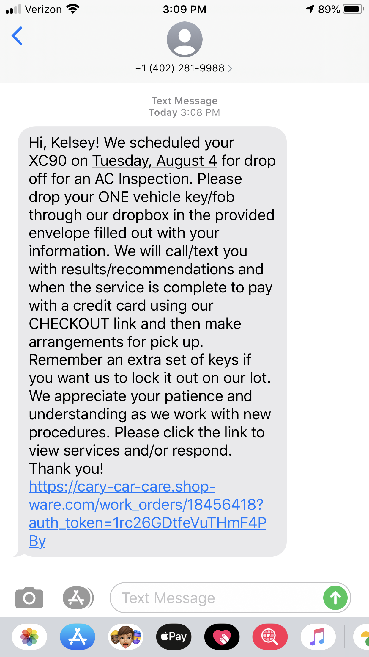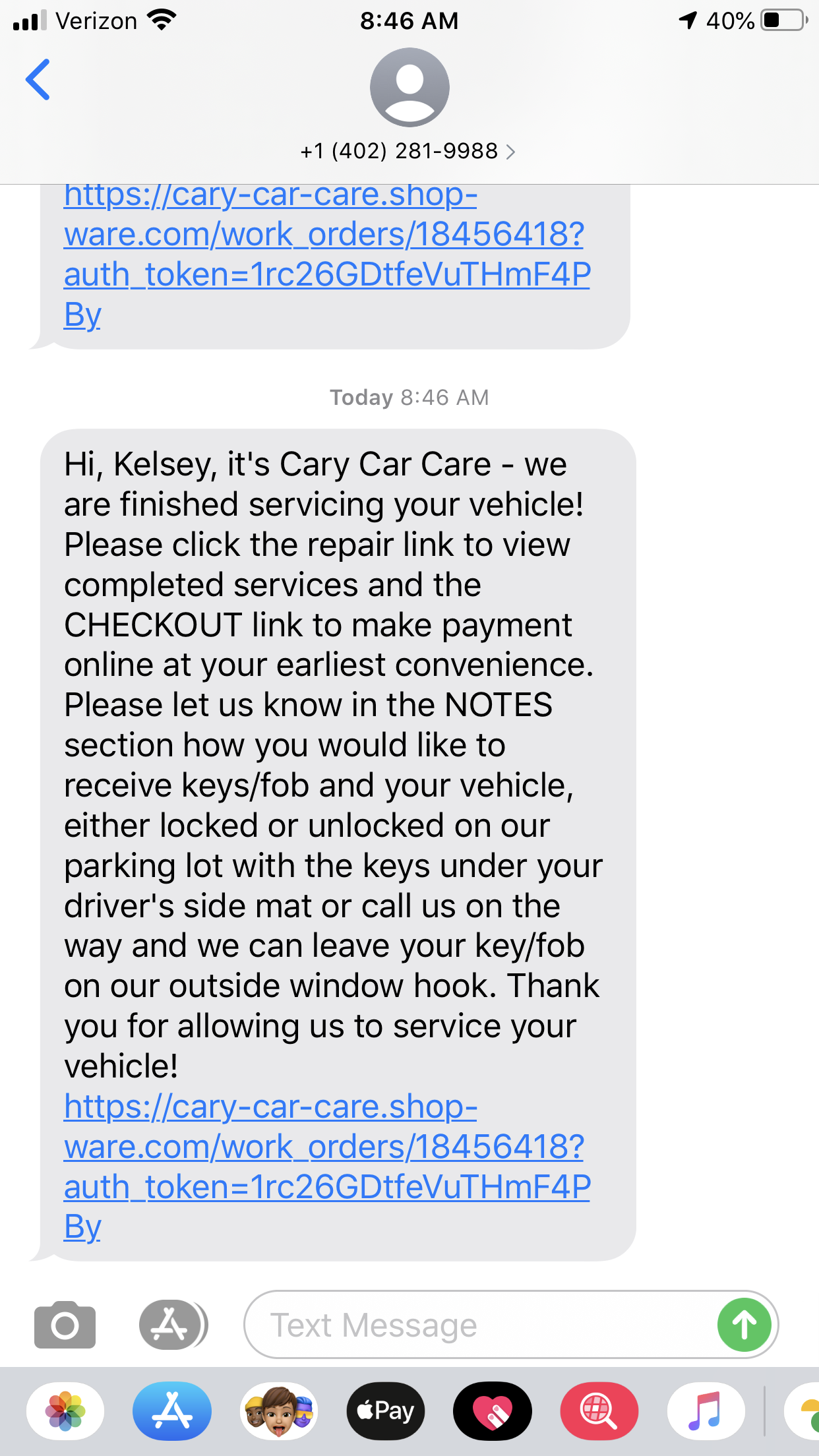 This link is unique to the final repair order and allows you to make a payment online by credit card.